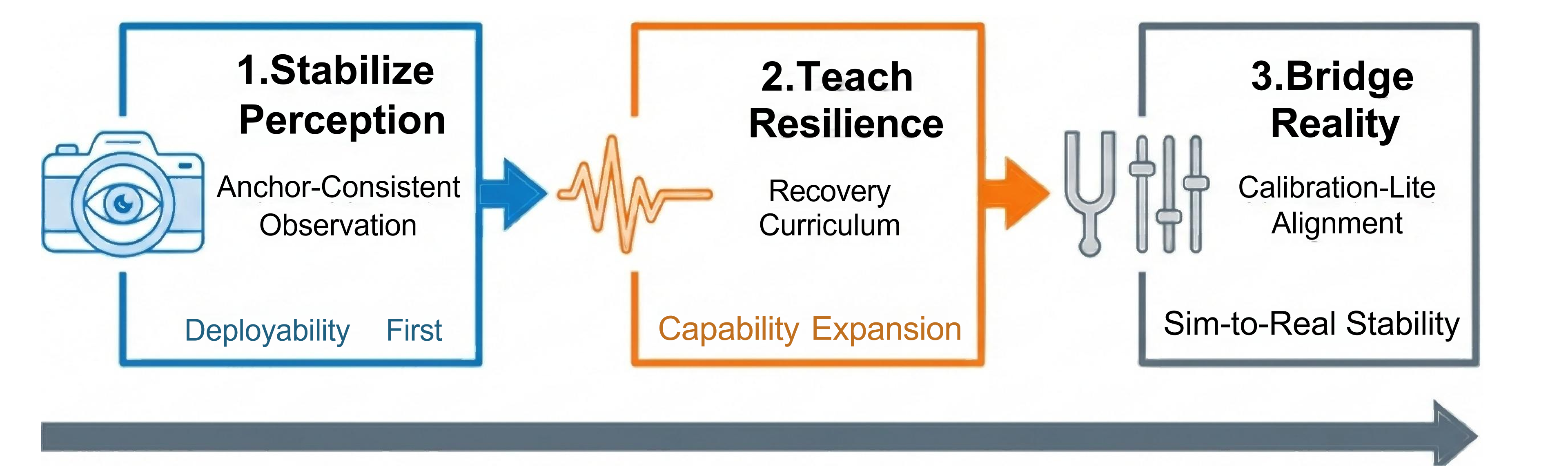 我们提出 ARC-VLA:Anchor & Recovery Curriculum for Vision-Language-Action,将目标从“仿真中完成任务”前移为“真实部署可用(deployable competence)”。核心观点是:sim-to-real 的主要失败往往来自静默失配(silent mismatch)、脆弱性(brittleness)与过度校准(over-calibration),尤其在传感噪声、光照变化与微小装配偏移下被放大。