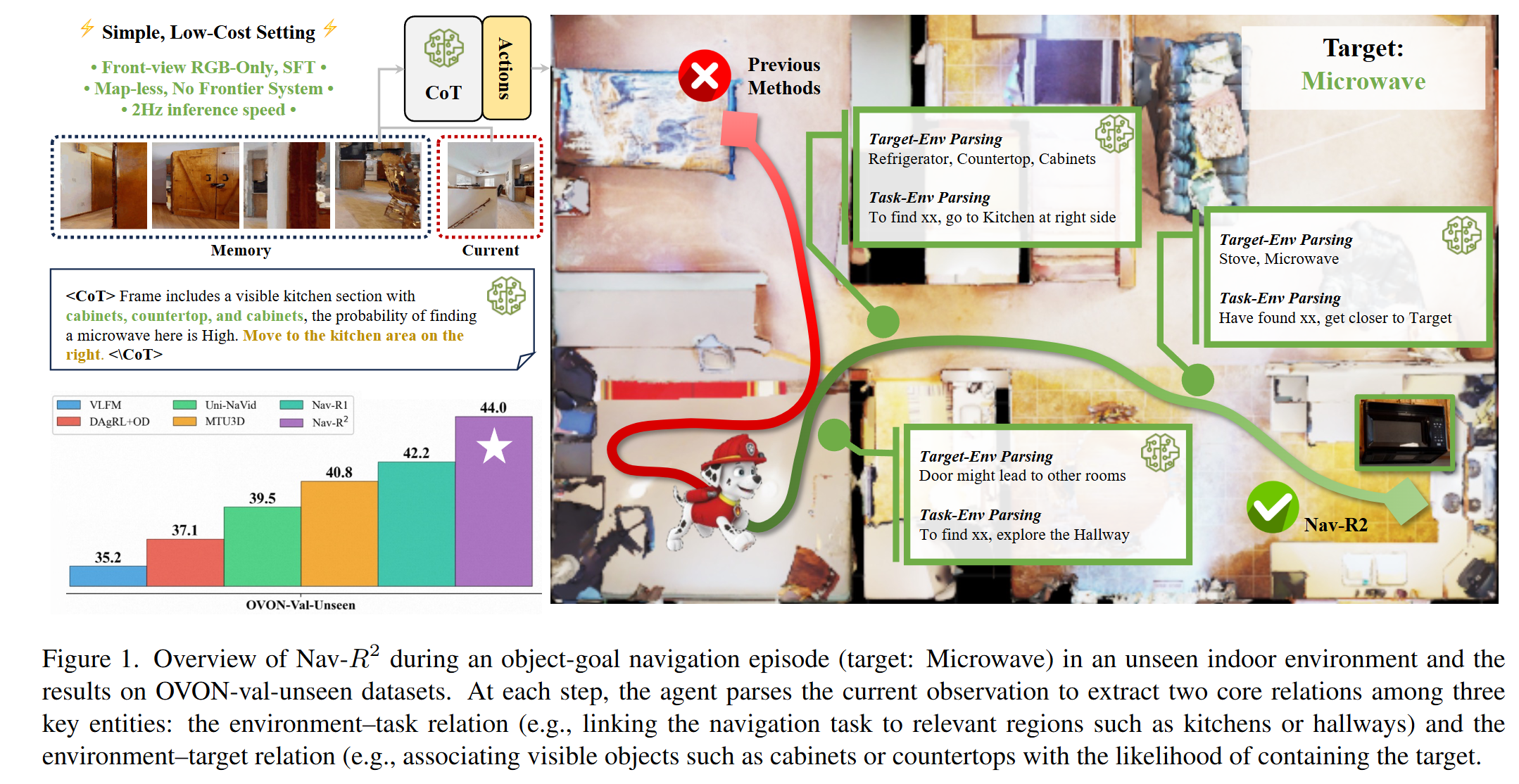 Nav-$R^{2}$ 成功地将类似于人类的“双重关系推理”机制引入到端到端的视觉导航模型中。配合高效的 SA-Mem 记忆机制和专门构建的 NavR2-CoT 数据集,该模型在不依赖深度传感器和预建地图的情况下,实现了开放词汇目标导航的 SOTA 性能。