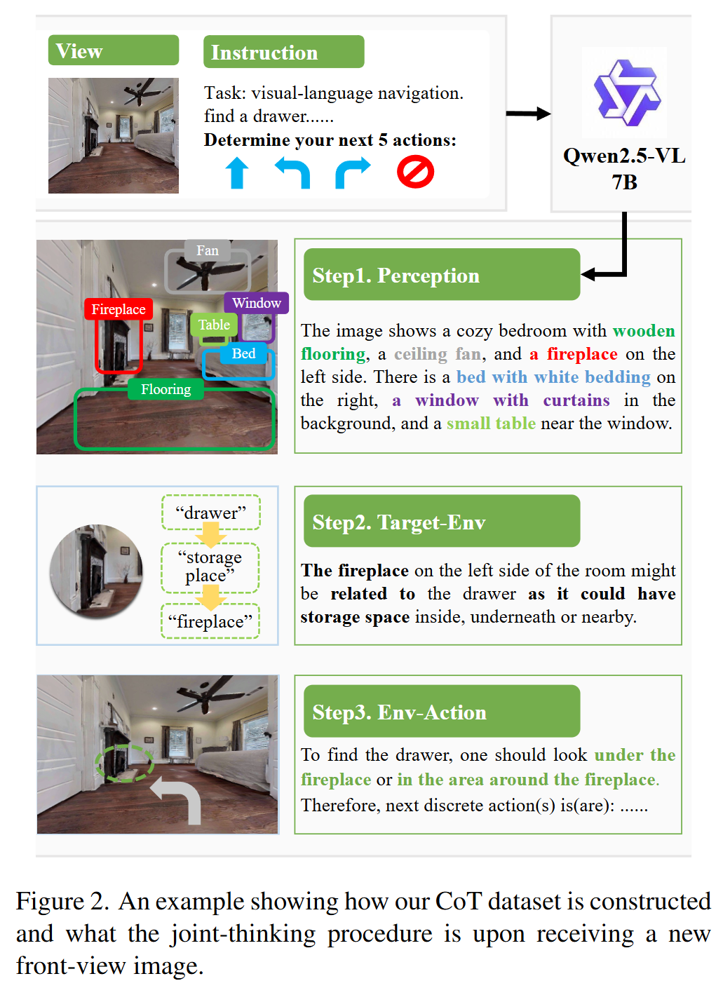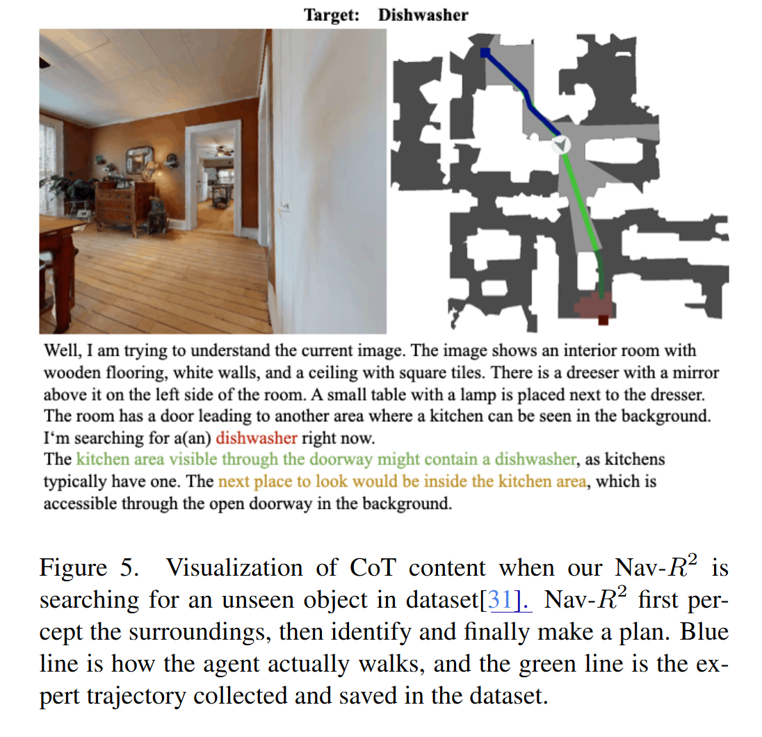 为了训练该模型,作者构建了 NavR2-CoT 数据集。利用 HM3D-OVON 数据集中的专家轨迹,配合 Qwen2.5-VL-7B 生成结构化 CoT 注释,并实施了严格的数据清洗(如去除表示不确定的词汇),最终获得约 30 万条高质量样本。在实现上,模型基于 Qwen2.5-VL-7B 进行全量监督微调 (SFT),推理速度可达 2Hz,实现了高效的实时导航。