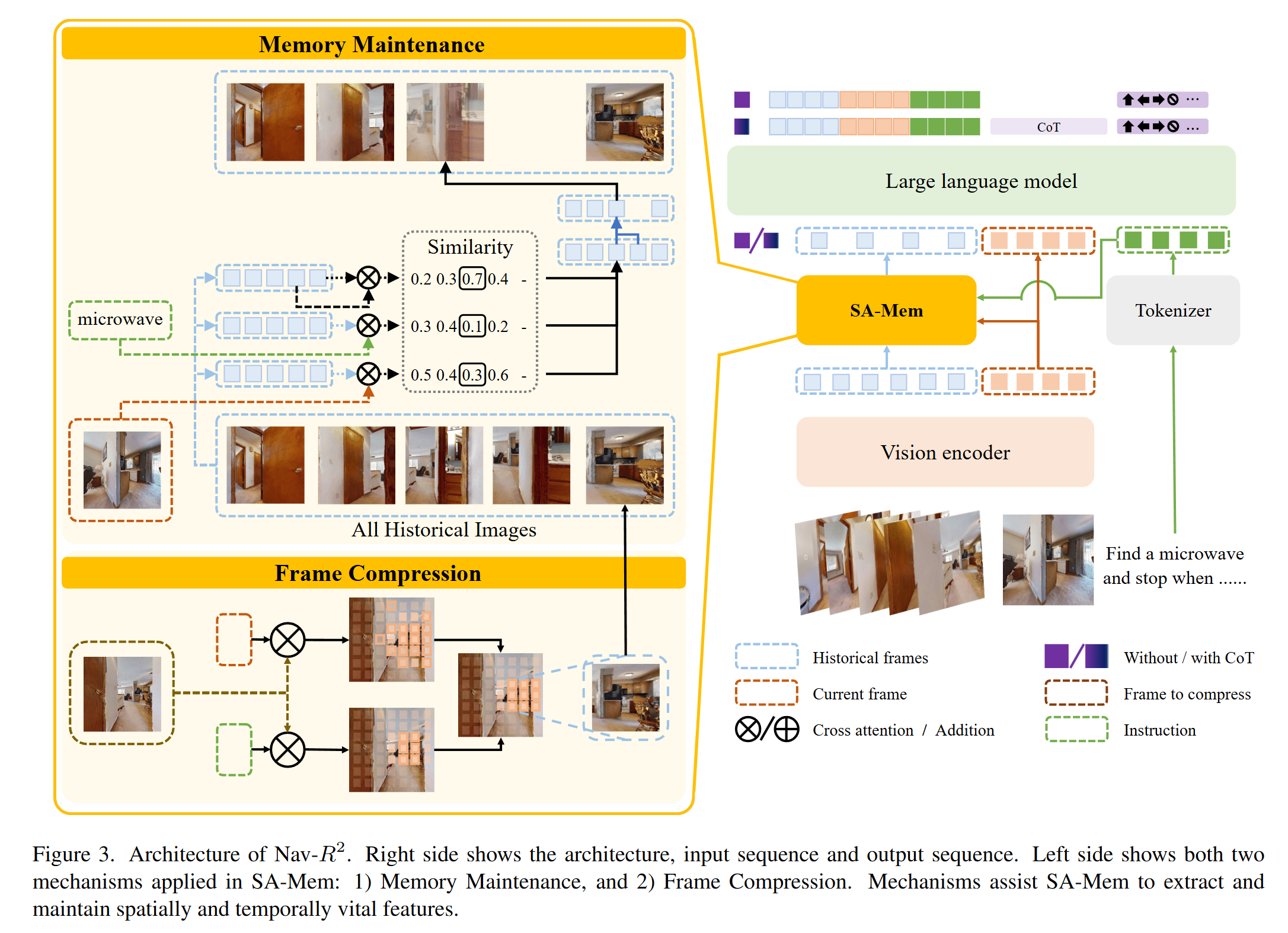 论文提出了 Nav-$R^{2}$ 框架,这是一个完全基于视觉-语言模型(VLM)的端到端系统。该系统仅使用第一人称 RGB 图像作为输入,摒弃了对深度图或预建地图的依赖。架构主要由三个部分组成:视觉编码器、相似度感知记忆 (SA-Mem) 以及大语言模型骨干 (LLM Backbone)。