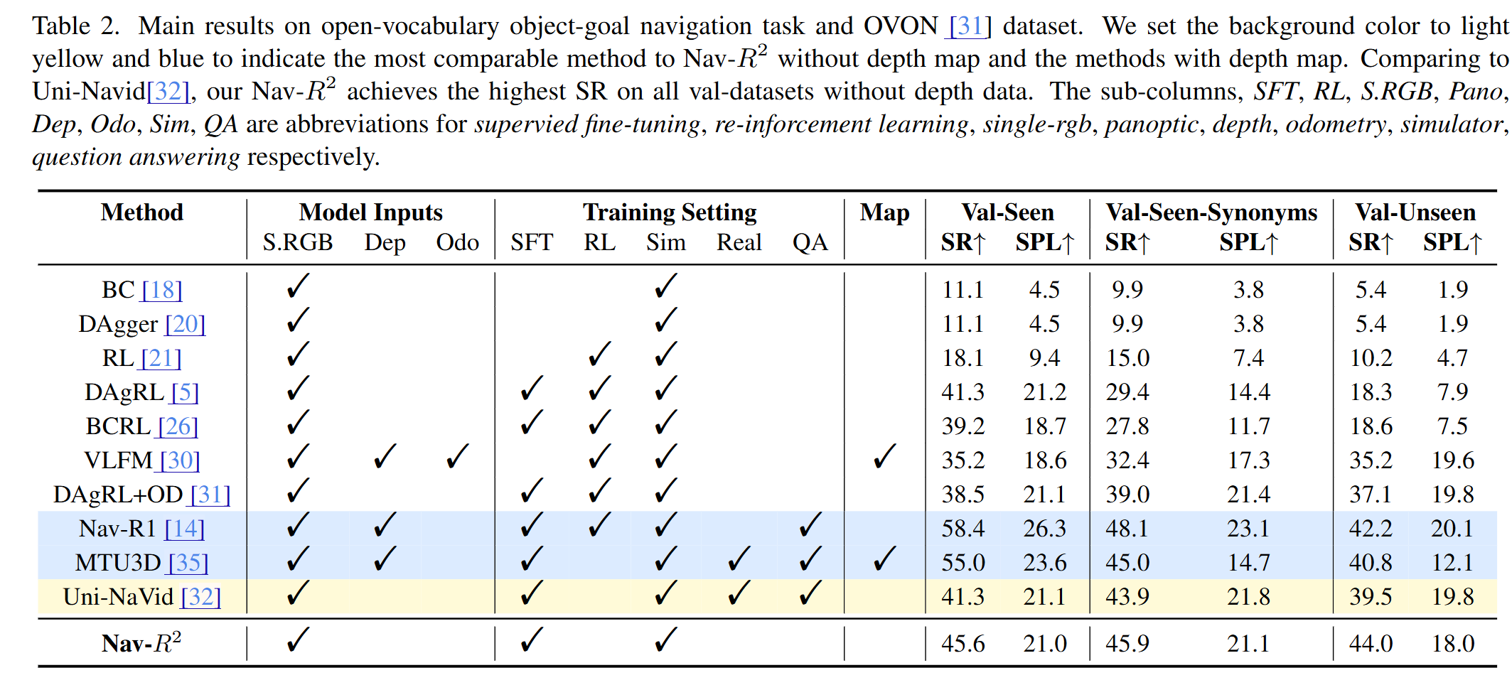 Nav-$R^{2}$ 展现了卓越的性能。在最具挑战性的 OVON-Val-Unseen(未见场景、未见物体)测试集上,取得了 44.0% 的成功率 (SR),显著优于之前的 SOTA 方法 Uni-Navid (39.5%)。值得注意的是,相比于依赖深度图的方法(如 Nav-R1, SR 42.2%),Nav-$R^{2}$ 仅使用 RGB 图像就在未见测试集上取得了更高的成功率。作者分析认为,这是因为摒弃深度图避免了模型对特定场景几何结构的过拟合,从而提升了泛化性。
