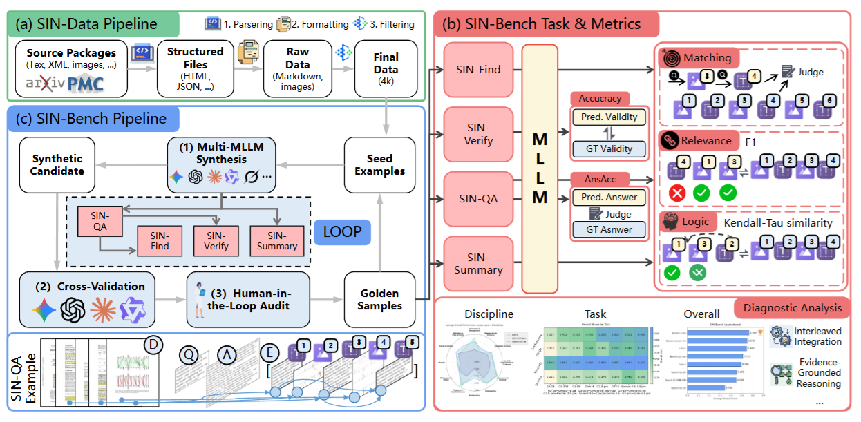 SIN-Bench(证据链驱动基准) 在 SIN-Data 上设计分层任务、统一证据接口,以及配套的证据驱动评测指标体系,并提供可扩展的样本构建流水线与黄金样本集。