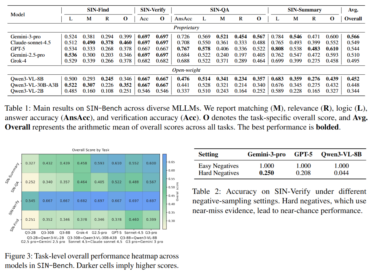 - 发布 SIN-Bench:四级任务 + 统一证据接口 + 证据驱动指标(MRL)与“无证据不评分”原则,实现可诊断评测。